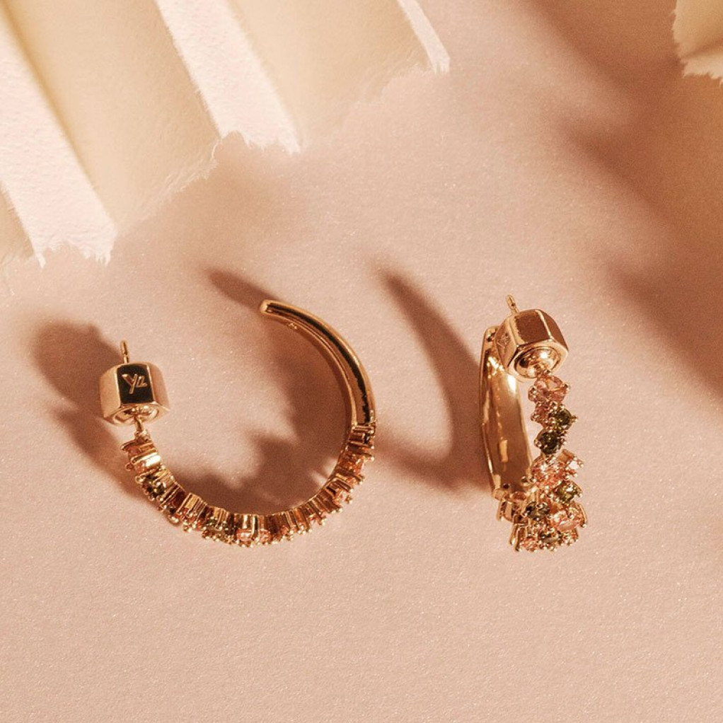En klassisk öppen hoops-design med en avantgardistisk twist – dessa eleganta örhängen har en kombination av peridotgrön samt ljusa och mörka topasfärgade cubic zirconia som glittrar bland delikata guldpläterade pärlor.